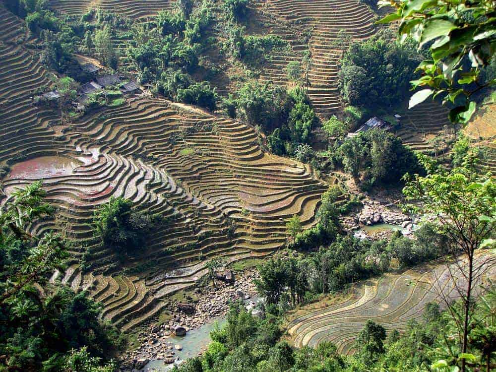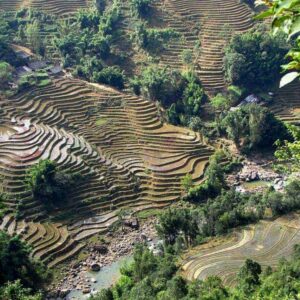 - 8:30 AM: Time to say goodbye to our family as we leave the homestay and continue our trek to visit the minorities in Giang Ta Chai village. We will pass bamboo forest and stunning scenery and a lovely waterfall along our route. The terrain can be steep at times and slightly challenging. Our journey leads us along the small paths edging the rice fields and across the Muong Hoa River.